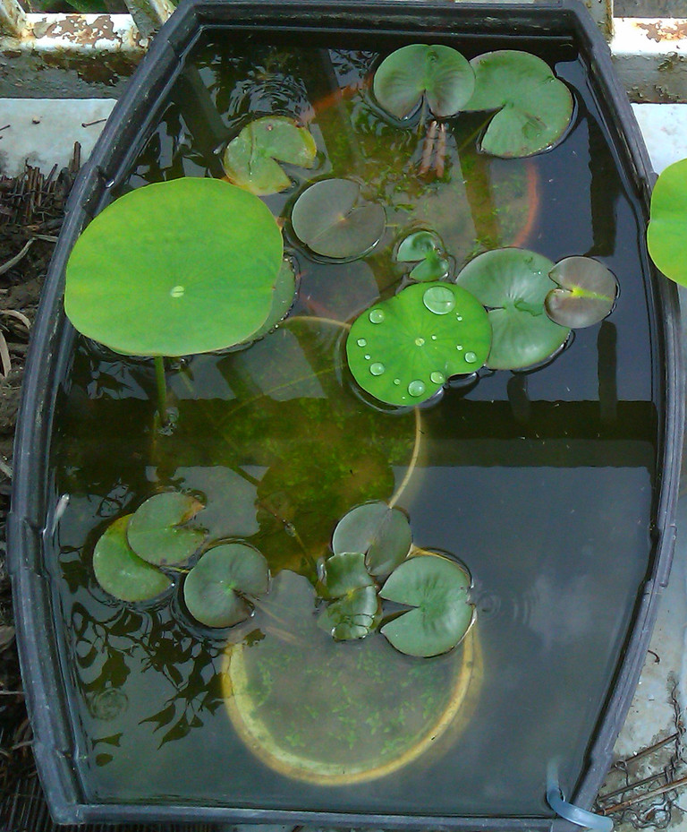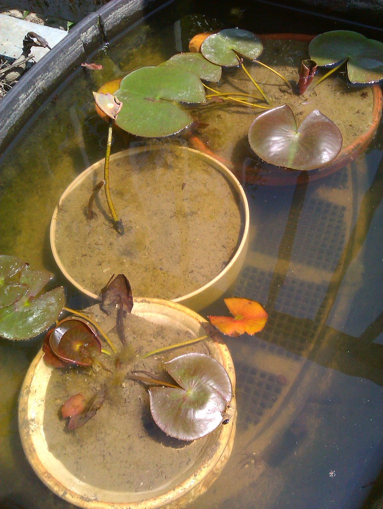 睡蓮の葉は、植え替え前に出ていた部分の生き残り。