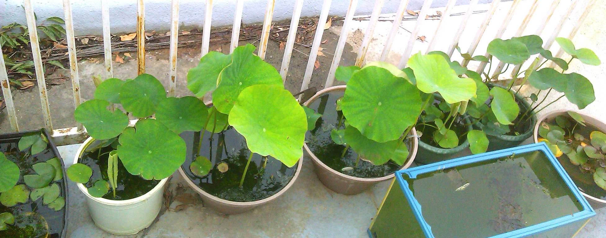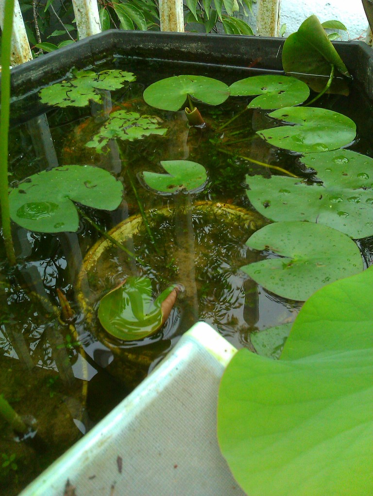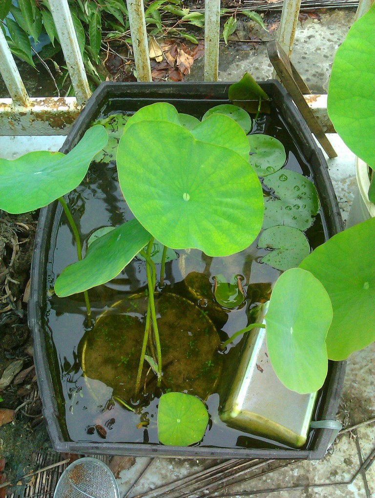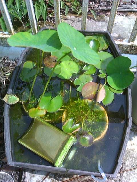 どんぶり育成にチャレンジ中の爪紅茶碗蓮は、葉だけはなんとか成長中。