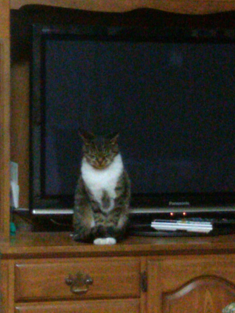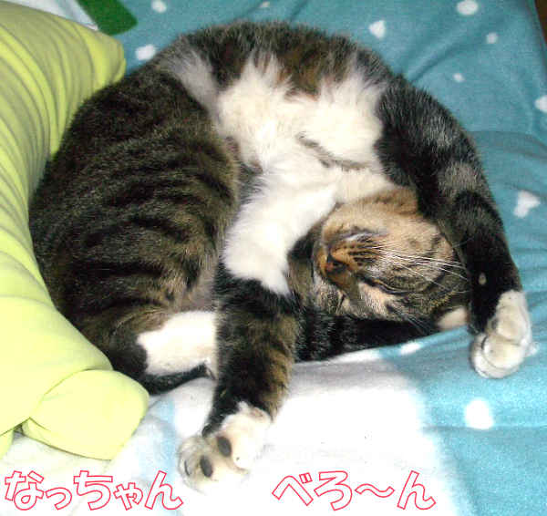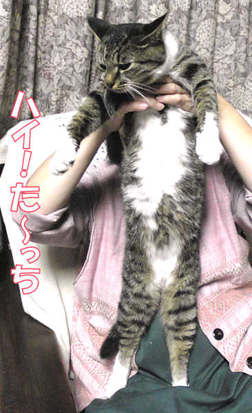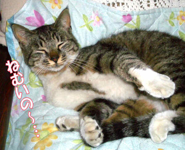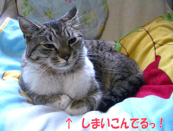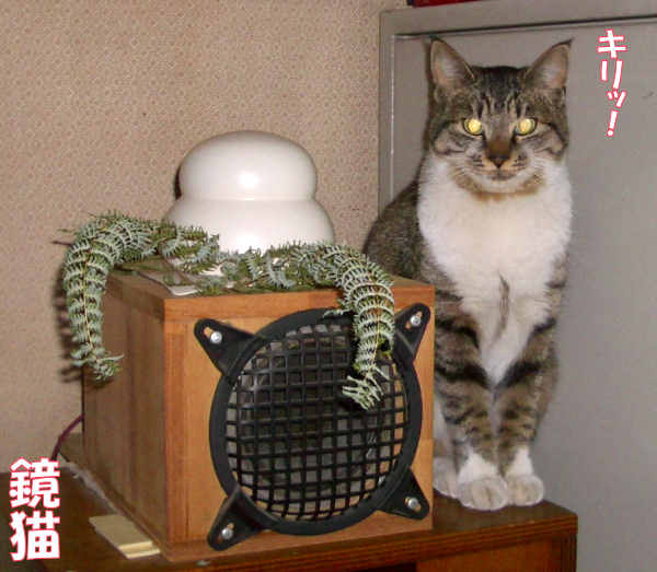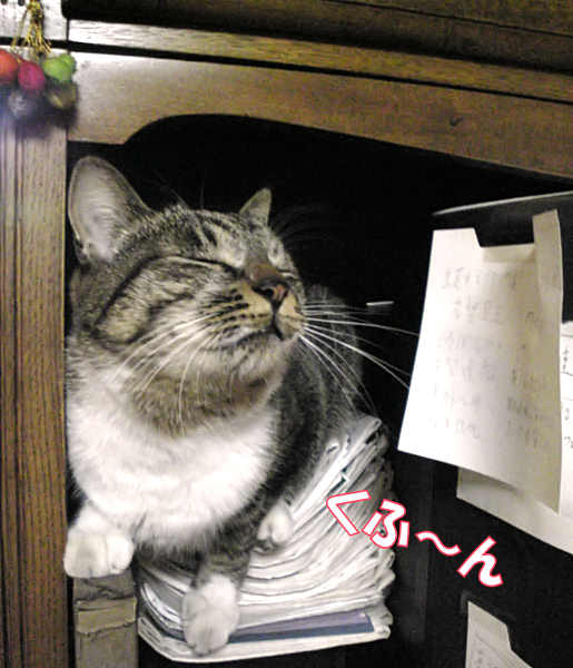 新しいケータイデジカメの練習のため、いろいろ撮っているんだけど、こんなに目を撮りやすいネコも珍しいと思う。他のネコはフラッシュを嫌がって、カメラの音がすると、すぐそっぽ向くもんなんだけど。