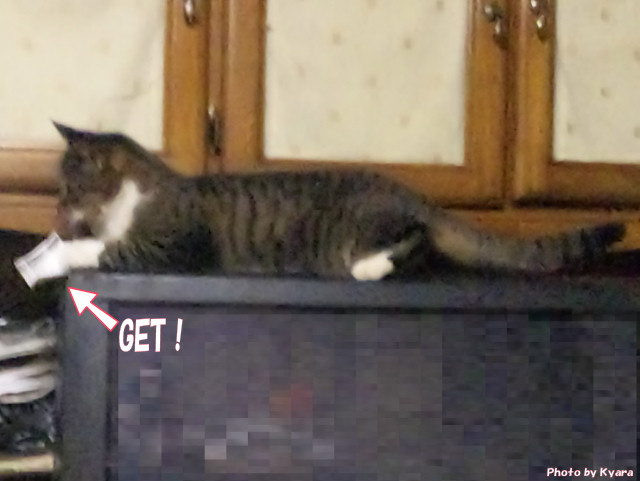 コネコにとっては新聞広告を丸めて、ビニール紐をつけただけでも立派なおもちゃ!