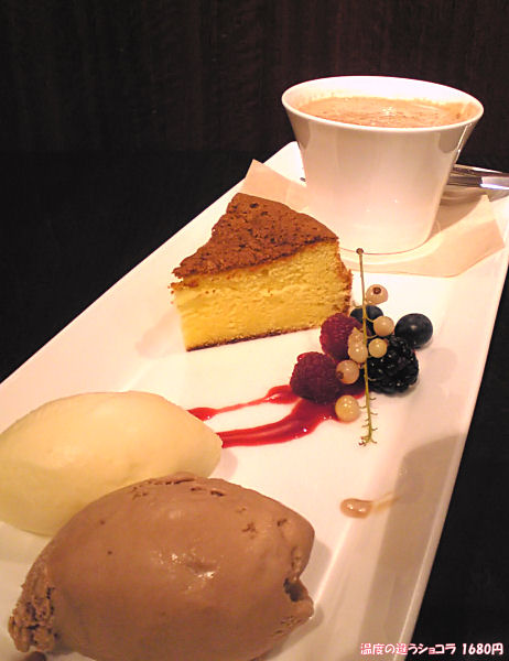 ◆温度の違うショコラ 1680円ホットショコラとアイス、そしてケーキの3種セット。ケーキは「ガトーショコラ・イヴォワール」。味見させてもらったけれど、ガトーショコラと言う名前にしてはチョコっぽさはサッパリ目だったかな。オレンジ味は好きなんでケーキとしては嫌いじゃないけれど。