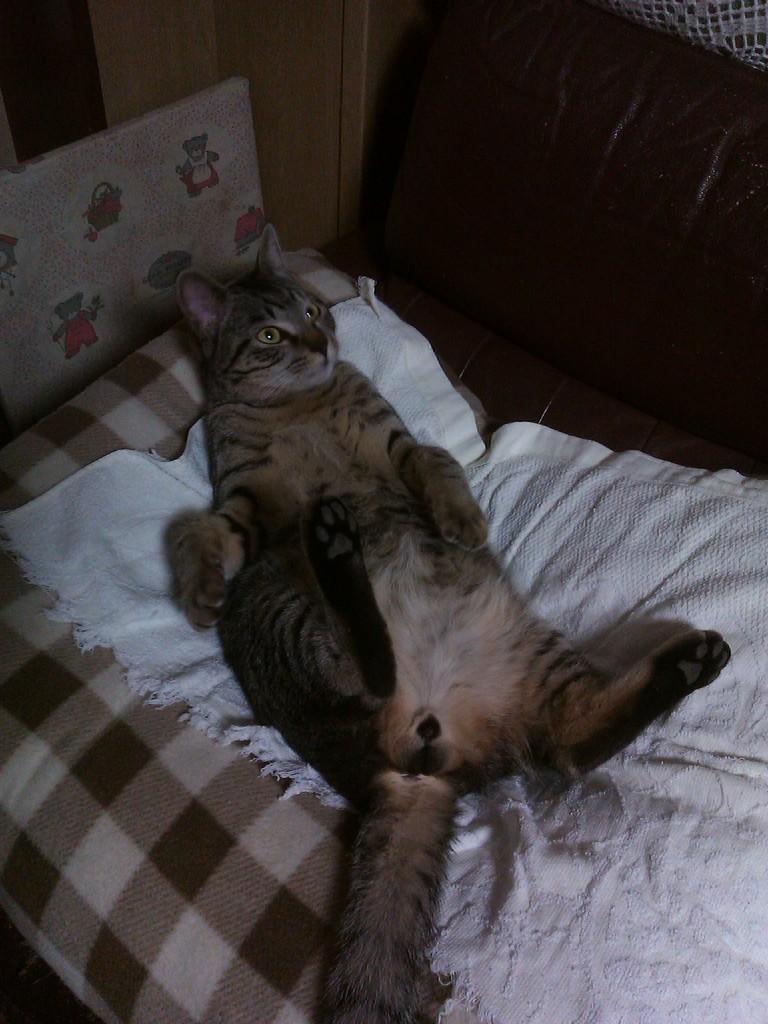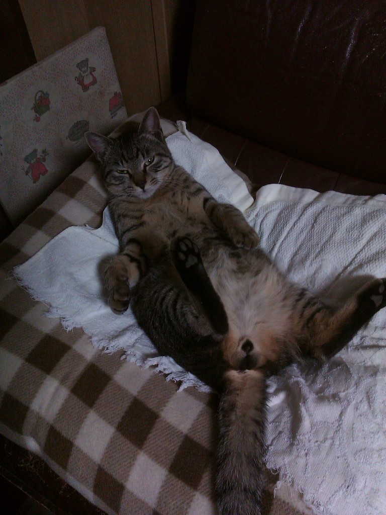 2012年01月13日 でっぷりぽんぽこりんネコ 昨年秋ごろ登場したネコ。人の気配がすると脱兎のごとく逃げる。そのくせ家に入ってきて飯を食う(-_-メ)なつかないんで外ネコ暮らしになるんだろうと思っていた。私も、捕まえようとしたらかなり流血沙汰になるほど噛まれたし。(もちろん引っ掻かれもしたサ┐( ̄ヘ ̄)┌)ところが、、、。あまりにも寒かったからか、家でこっそり寝るようになりそのうち人の気配に慣れ、、、。今じゃこーよ、こー┐(-。ー;)┌でへ〜ん♪え?なにぃ〜あぁ〜? なーによ? もんくあるー? それに、ものすごいぽんぽこりんボディーなのよ。お腹がぱっつんぱっつん。毛が短いもんだからさらにパツパツ具合が激しい。