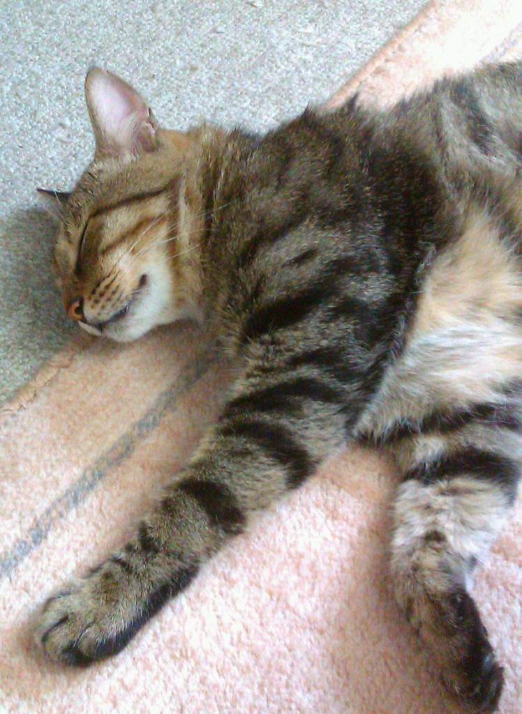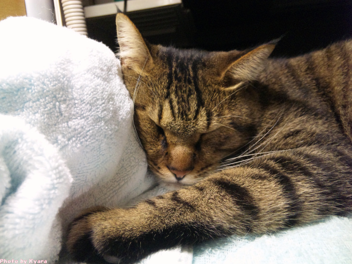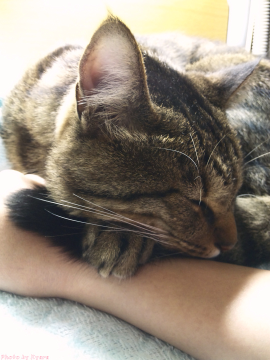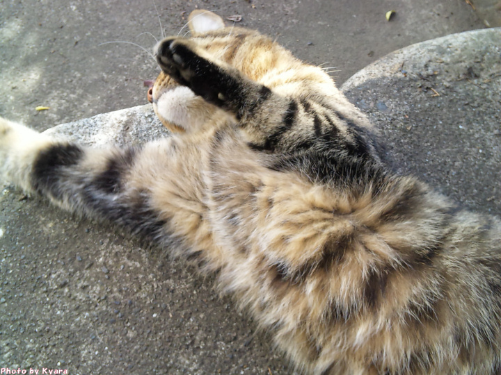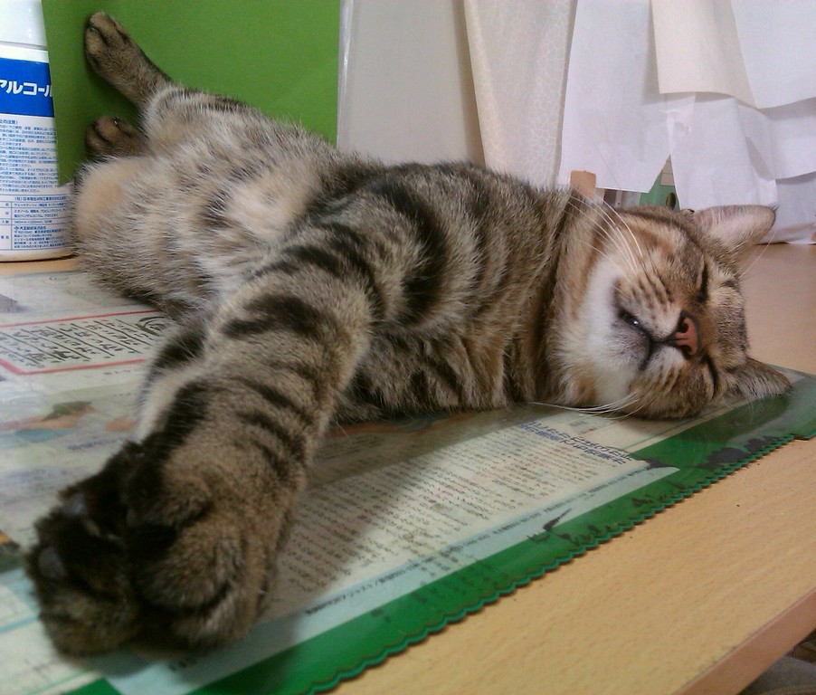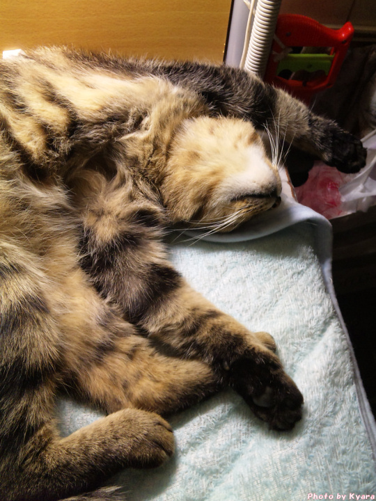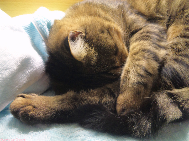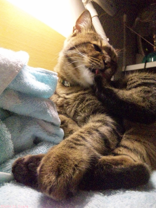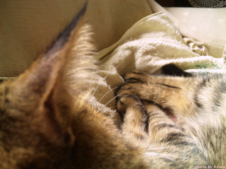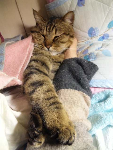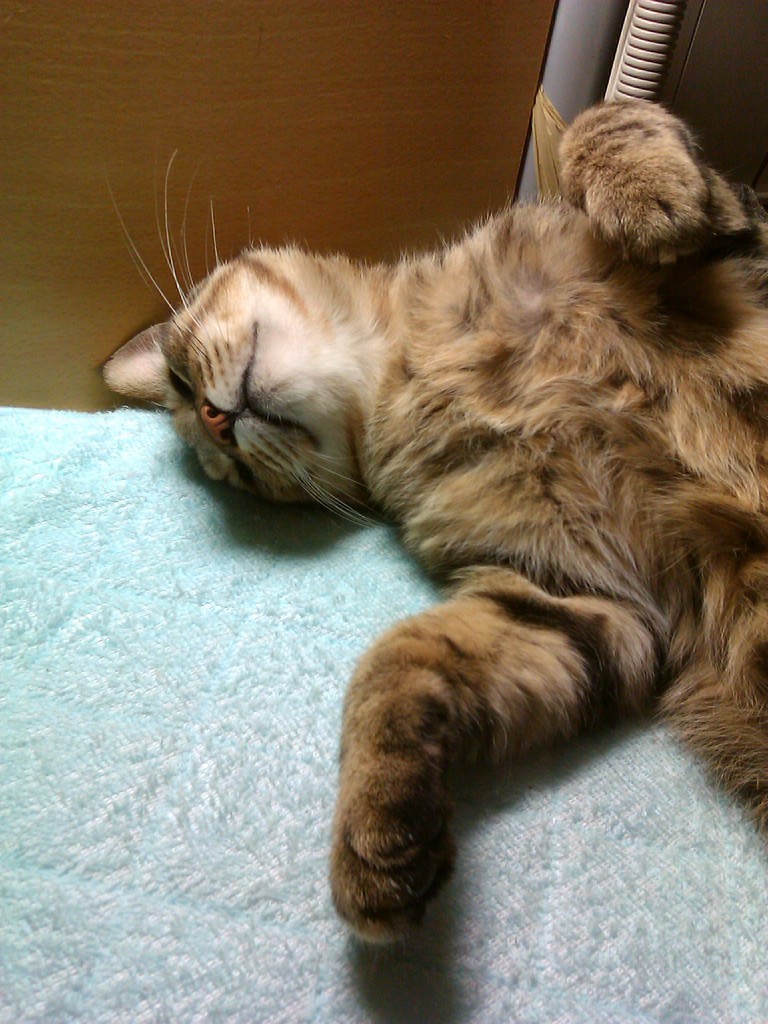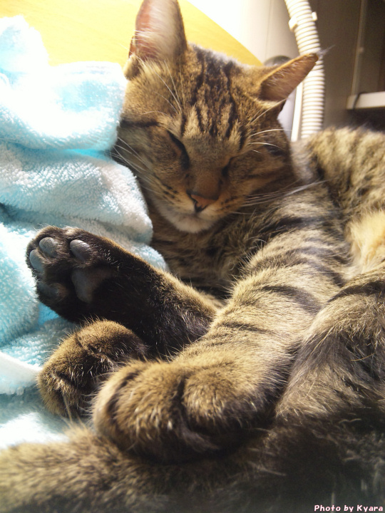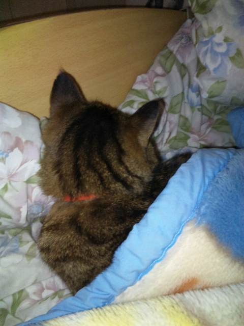 2010年11月03日 夜中の政ちゃん ◆猫足〜(〃∇〃) 枕元で丸くなる政宗のテキトーにまとまった足 ◆睡眠中 私はちょっと本でも読んで…なんて電気をつけている。 あまり長い時間付けてると政宗もブチッと切れる時があるけど、 たいていは無関心で睡眠をむさぼっている。 ◆あっ!起きちゃった ケータイカメラのシャッター音がうるさくて起きてしまった。 ◆身づくろい