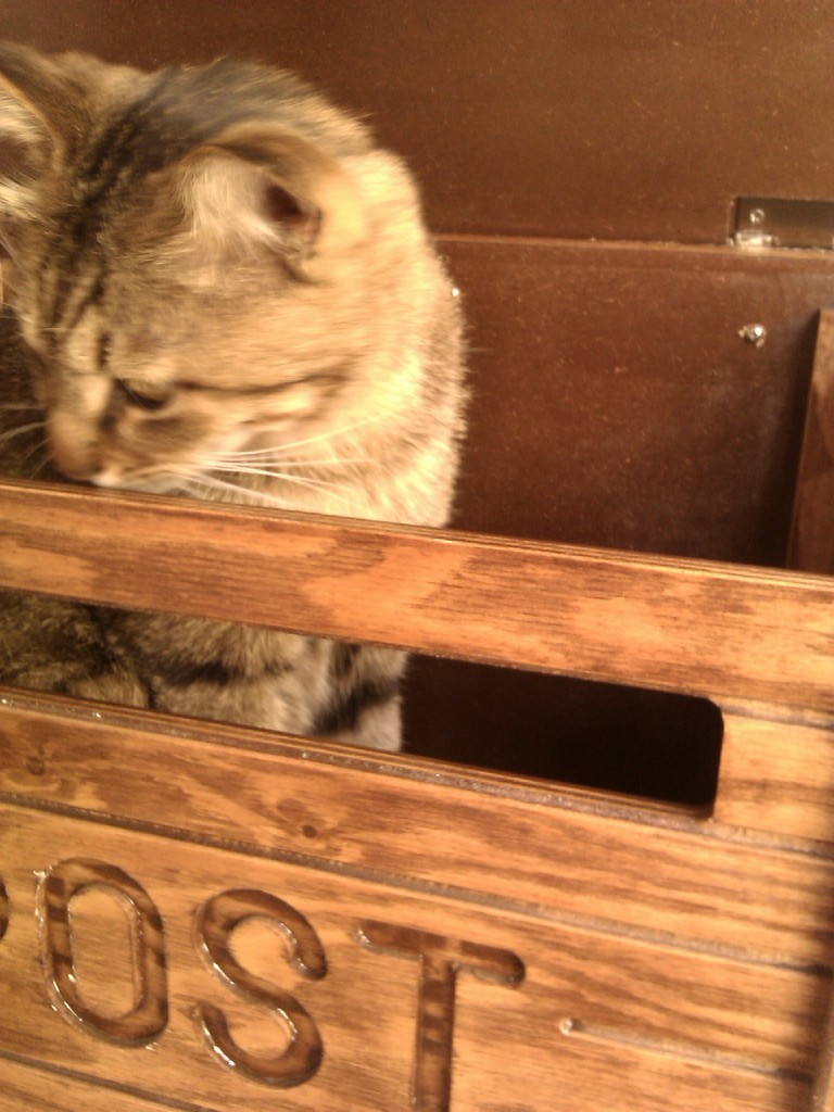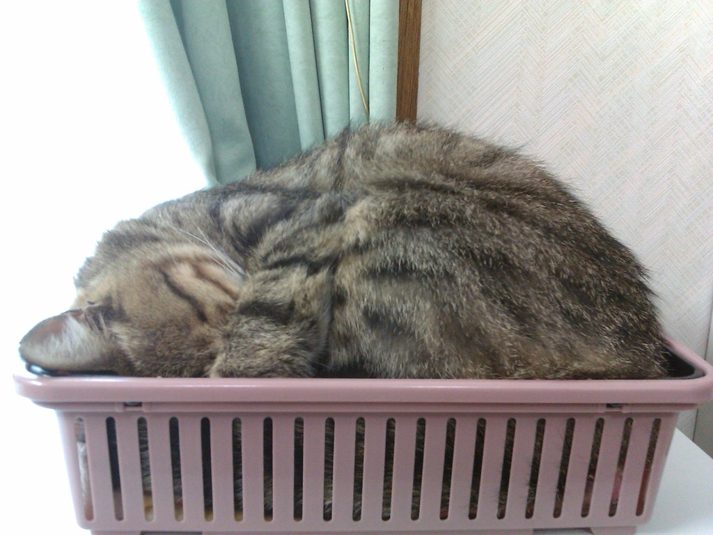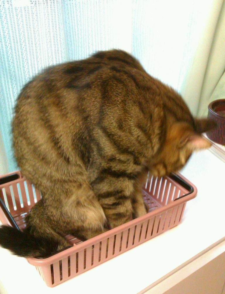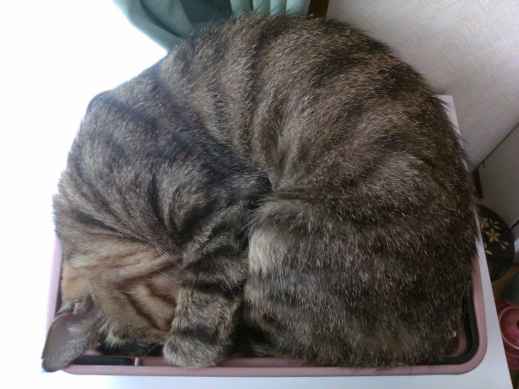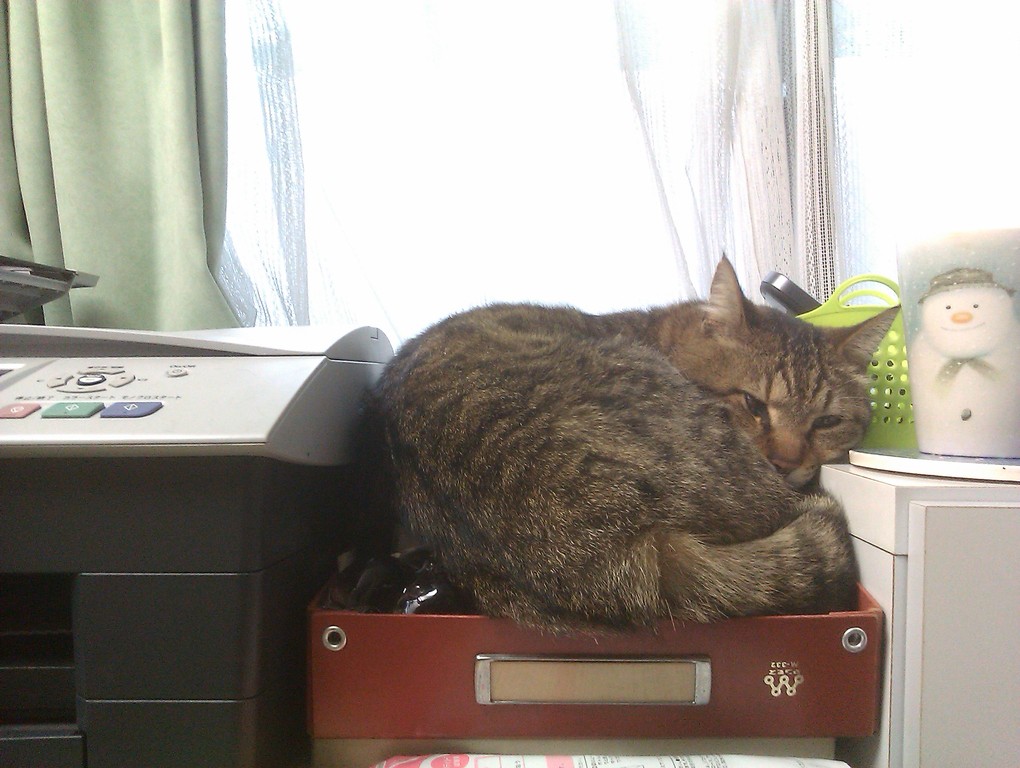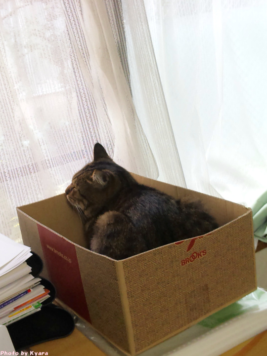 2010年11月13日 箱入り○○ ◆段ボールに収まりこむ政宗 夏は窓際の段ボールが涼しくて好きそうだったけど、さすがに冬は窓際は寒いだろう…と思ってたんだけど、今日はちょっとあたたかいし案外良いみたい。 夏に段ボールを設置していたところにポンとおいてやったらいそいそ入り込んで、あっという間に丸まってしまった。