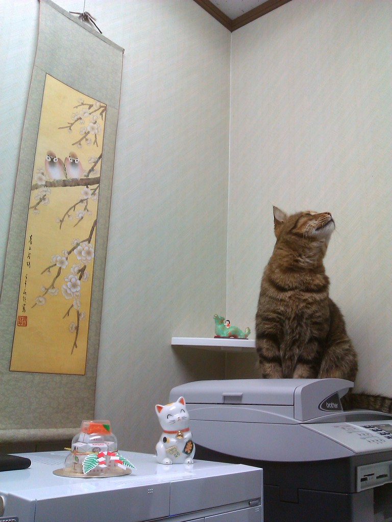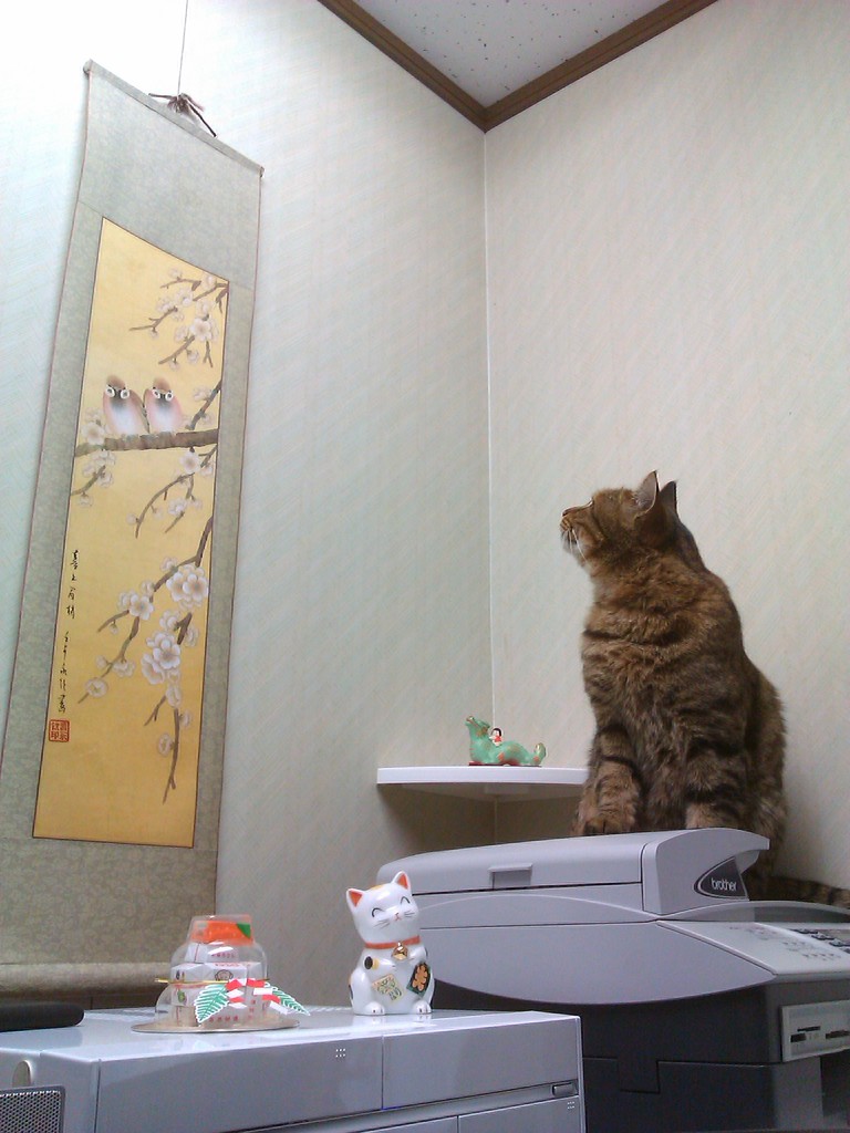 2012年01月01日 きれいにしすぎた…(;´Д`)ノ 元日の昼下がり…。 キョロキョロ正宗君。 …と、この後おもむろに立ち上がり、掛け軸のちょっと横に…あろうことか臭いつけをしやがったーっ/( ̄0 ̄)\ぎゃーっ31日〜1日の未明にかけて、最後に残ったこの部屋をきれいにしまくったんだけど、 どうやらそれが気に食わなかったらしい。においが消えて「ボクの陣地」という気がしなくなっちゃったんだろうね。 大急ぎで拭いたわけだけど、元日からやめてくれよなーもー<( ̄^ ̄)>一応かろうじて掛け軸にはかかっていなかったようなのがせめても…。
